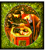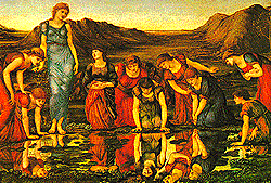 The Greeks' belief in malignant water spirits was probably the forerunner of the myth of Narcissus. This beautiful youth followed the hunt in the mountain forests, where the nymphs saw him and fell in love with his beauty. But he cruelly rejected them all. A nymph whom Narcissus had turned away prayed that he might some day come to know how it felt to be spurned. The gods heard her wish and granted it. One day, tired and thirsty from the hunt, Narcissus came upon a clear, unspoiled woodland fountain and stooped to drink. In the still, crystalline water, he saw an image of rare beauty that he took to be the fountain's resident water spirit, and he was smitten with love. He yearned after his love in the fountain's clear water, but received no response. Slowly, rejection overcame him, and he pined away and died. His body was never found -- in its place was the beautiful purple flower that now bears his name. It was told that when his soul crossed over the Styx, he leaned over the boat's edge for another glimpse of his love.